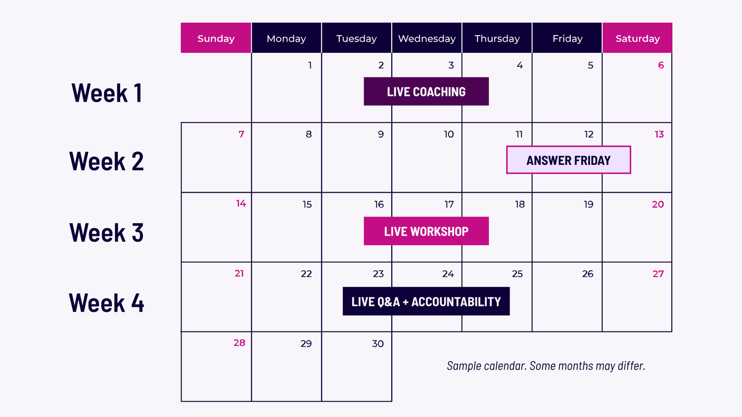 Yes. Workshops, coaching sessions and Q&A + accountability sessions are recorded and added to the members-only library, and Answer Fridays videos are also added to the library 1-2x/month. So even if you cannot attend the live events, you still have access to all the value - accessible and easy to find any time you need it.