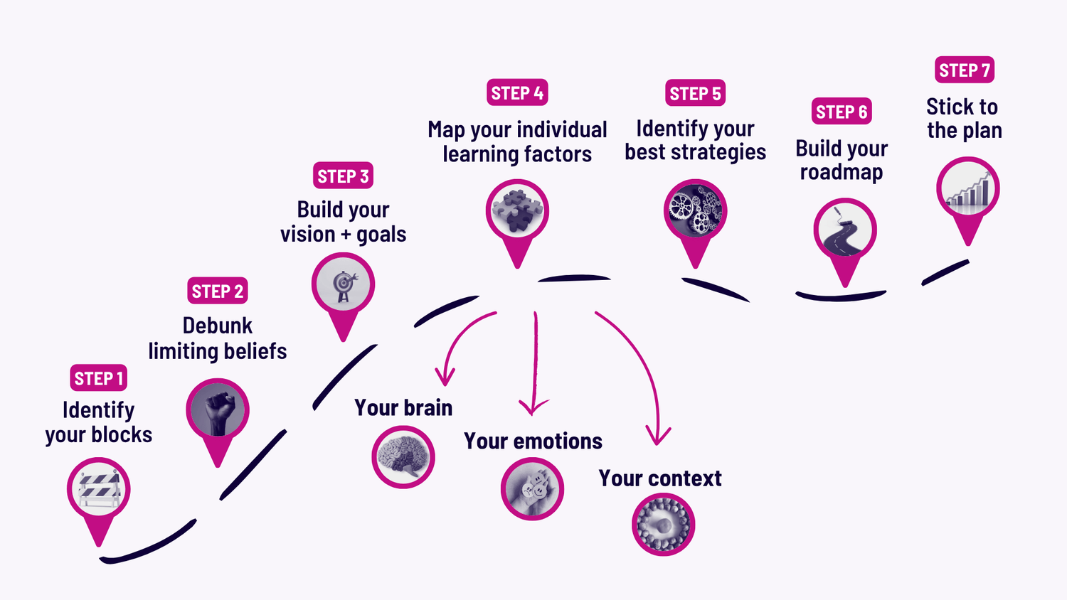 We will identify and map the many different factors that are impacting your learning outcomes, including assessments to understand how your brain learns, how your emotions affect your learning, and how your environment can be leveraged for faster progress.