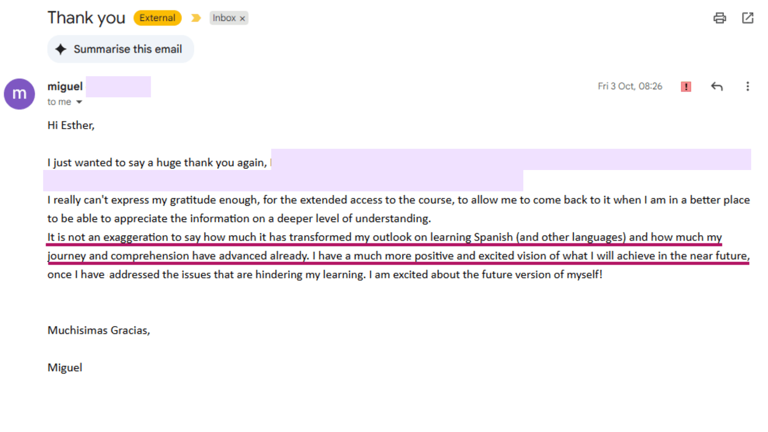Miguel has gone from "I'll never be able to communicate with my Spanish family" to a clear plan and vision to become that future version of himself who is fluent in Spanish